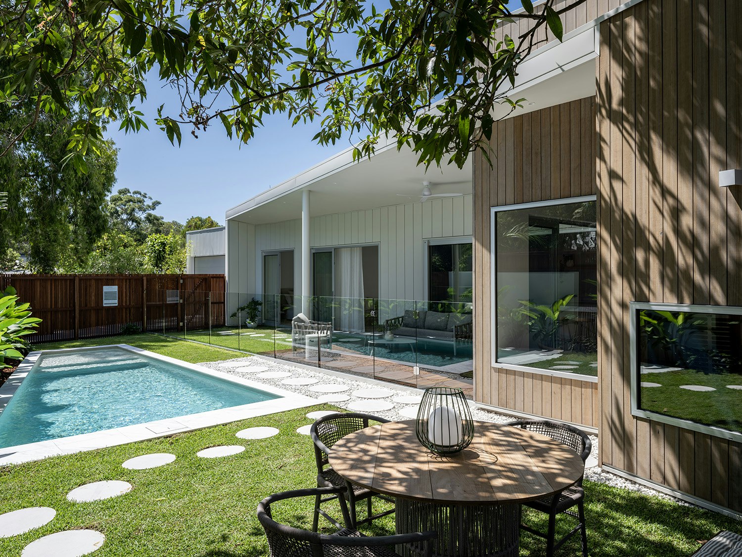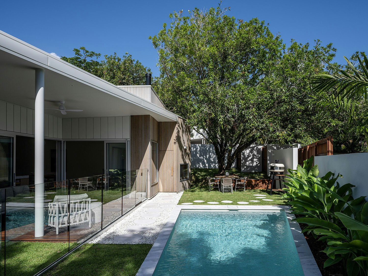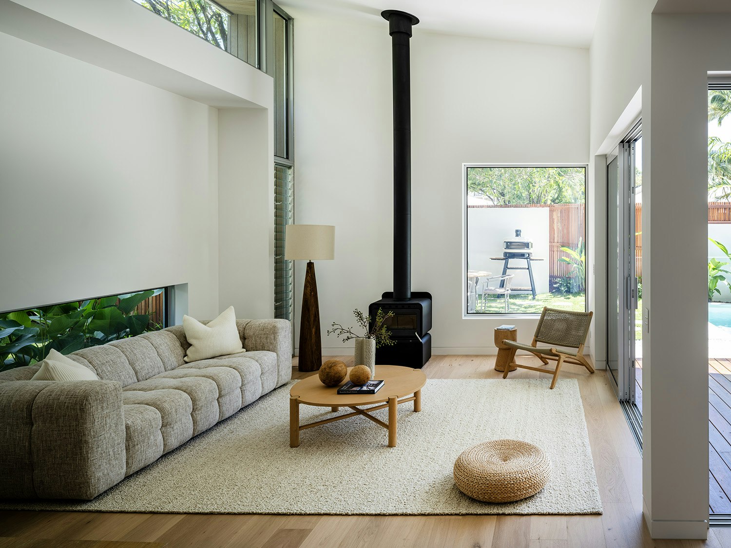 Only one wall from the original house remained in this dramatic transformation. The home was completely reimagined, both inside and out, with an additional 100 m² creating an extra bedroom, a spacious living area, and a luxurious master ensuite. A new roofline allows soaring 4‑meter ceilings in the indoor and outdoor living spaces, giving a true sense of openness. Standout features include an outdoor sauna, a new pool, and a private terrace courtyard off the master suite.